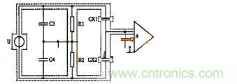 disangewentishifenbudianrongdeyingxiang。youyudianrongchuanganqiyigehenguanjiandewentishifenbudianrongdianrongliangyuchuanganqidianrongliangxiangbibujinbunenghulve,erqieyingxianghaijiqiyanzhong,qihouguoshizaochengchuanshuxiaolvjiangdi、靈敏度下降、測量誤差增加及穩定性變差。近幾年來,對此問題有了新的解決途徑。其中“整體屏蔽法”就是一例,以差動電容傳感器為例,說明整體屏蔽法,在下圖中,CX1、CX2為差動電容,U為電源,A為放大器,整體屏蔽法是把整個電橋(包含電源電纜等)一起屏蔽起來,設計的關鍵點在於接地點的合理設置。采用把接地點放在兩個平衡電阻R1、R2之間與整體屏蔽共地,這樣,傳感器公用極板與屏蔽之間的分布電容C1與放大器的輸入阻抗並聯,從而可把C1視作放大器的輸入電容。由於放大器的輸入阻抗有極大值,C1的並聯也不希望存在,但它隻影響靈敏度而已,另外兩個分布電容C3、C4並聯在橋臂R1、R2上shang,會hui影ying響xiang電dian橋qiao的de初chu始shi平ping衡heng和he整zheng體ti靈ling敏min度du,並bing不bu影ying響xiang電dian橋qiao的de正zheng常chang工gong作zuo。因yin此ci,分fen布bu參can數shu對dui傳chuan感gan器qi電dian容rong的de影ying響xiang基ji本ben消xiao除chu,整zheng體ti屏ping蔽bi法fa是shi解jie決jue電dian容rong傳chuan感gan器qi分fen布bu電dian容rong問wen題ti的de很hen好hao方fang法fa,缺que點dian是shi使shi結jie構gou複fu雜za。