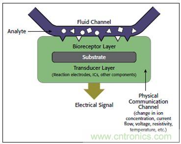 電化學生物傳感器正在用於許多應用。通常,電化學生物傳感器基於產生或消耗電子響應的酶(這種酶稱作氧化還原酶)促作用。該傳感器基底可能包括3個電極:參考電極、工作電極和反電極。目標分析物涉及在活躍電極表麵發生的反應,這個反應可能引起跨越雙層的電子傳輸(產生電流),還有可能貢獻雙層電勢(產生電壓)。既可以在固定電勢下對電流進行測量(電子流速與分析物濃度成正比),也可以在零電流情況下對電勢進行測量(這給出了對數響應[1])。