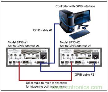 上圖還給出利用GPIB程控通信接口實現的通信連接。利用GPIB電纜(#1)實現計算機(控製器)GPIB端口與2450型儀器(#1)後麵板IEEE-488插孔的連接。利用GPIB電纜(#2)實現兩部2450型儀器IEEE-488插孔之間的連接。