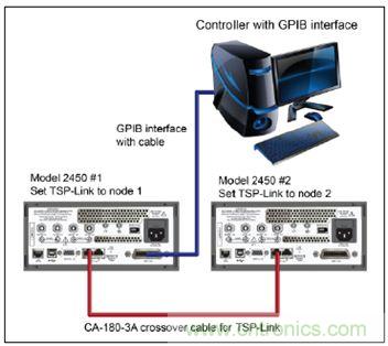 對於計算機與2450型儀器的GPIB通信,隻需要1根電纜,實現GPIB接口與2450型儀器IEEE-488接口的連接(圖8中2450型#1)。將2450型#1的TSP-Link節點設為節點1,將2450型#2的TSP-Link節點設為節點2。