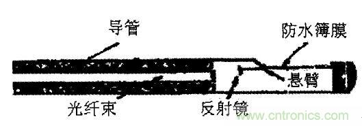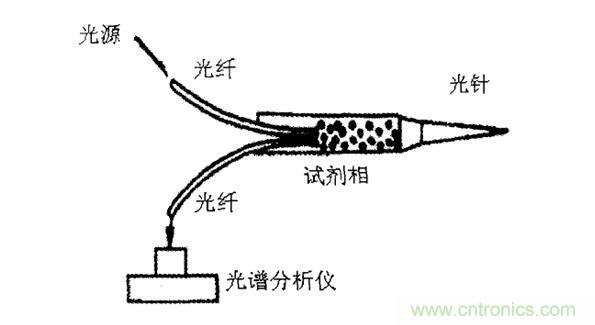 用來測定活體組織和血液值pH光纖光譜傳感器示意圖,如圖5所示。其工作原理是利用發射光、透射光的強度隨波長的分布光譜來進行測量。這種傳感器將兩根光纖插入可透過離子的纖維素膜盒中.moheneizhuangyoushiji,dangbazhentoucharuzuzhihuoxueguanhou,tiyeshenrushiji,daozhishijixishoumouzhongbochangdeguang。yongguangpufenxiyicechucizhongbianhua,jikeqiudexueyehuozuzhidepH值。