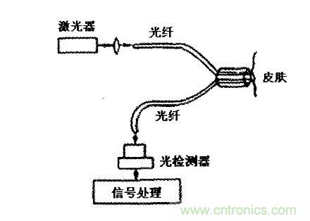 2、血流速度測量多普勒型光纖速度傳感器測量皮下組織血流速度的示意見圖4此裝置利用了光纖的端麵反射現象,測量係統結構簡單。