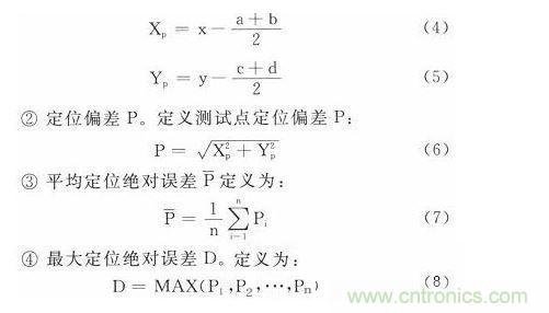 ①偏差Xp、Yp。假設在物理平台上測試點的網格坐標取值範圍為X∈[a,b],Y∈[c,d](a、b、c、d為非負整數,b-a=d-c=1,單位為cm)通過軟件求得的坐標為(x,y),定義偏差Xp、Yp: