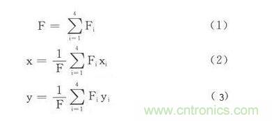 在圖1所示的模型中,Si(i=1,2,3,4)表示第i個壓力傳感器。在P平麵的二維坐標係中,記Si與P平麵的接觸點(或接觸麵的中心點)的坐標為(xi,yi),4個接觸點構成的矩形區域(虛線框內)稱為定位區D。在D中任一點(x,y)處施加一垂直於P平麵的力F,令Fi表示Si受到的F的分壓力,根據四支點平麵物體重心位置計算公式,式(1)~(3)成立。