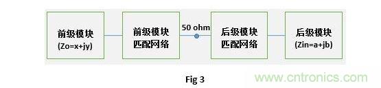 間接匹配,如Fig 3所示。把前級輸出阻抗和後級輸入阻抗,分別匹配到50ohm。這樣前後級就通過50ohm這個“中間人”匹配到了一起,這就是所謂的間接匹配。