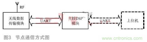 在傳感器網絡中,采用ZigBee通信協議時,節點被分為Coordinator、Router以及End Device三種。Coordinator負責係統的初始化工作,選擇網絡的信道等參數建立網絡,供其他節點加入;Router負責節點之間命令消息的路由轉發實現;End Device負責任務是消息的發送和接收,隻能和父節點進行數據通信,不具有路由轉發的功能。在本係統中,Sink節點主要負責監控網絡的建立、上位機命令的分析處理和操作、數據的收集等任務,是整個網絡的數據存儲和處理中心,在上位機和監控網絡之間起到橋梁的作用,是係統應用中的Coordinator。監(jian)控(kong)網(wang)絡(luo)區(qu)域(yu)內(nei)的(de)待(dai)定(ding)位(wei)節(jie)點(dian)要(yao)具(ju)備(bei)消(xiao)息(xi)轉(zhuan)發(fa)與(yu)路(lu)由(you)其(qi)他(ta)節(jie)點(dian)的(de)能(neng)力(li),需(xu)要(yao)可(ke)以(yi)給(gei)所(suo)有(you)節(jie)點(dian)發(fa)送(song)消(xiao)息(xi),也(ye)可(ke)以(yi)接(jie)收(shou)到(dao)所(suo)有(you)節(jie)點(dian)的(de)消(xiao)息(xi),是(shi)係(xi)統(tong)應(ying)用(yong)中(zhong)的(de)Router。每個節點由無線數據傳輸模塊和主控DSP模塊組成,同一節點的兩個模塊之間通過UART總線進行通信。節點之間通過無線RF射頻方式進行通信。Sink節點與上位機使用UART總線進行通信,未知節點的通信方式中並不包含該通信方式。節點的通信方式如圖3所示。
