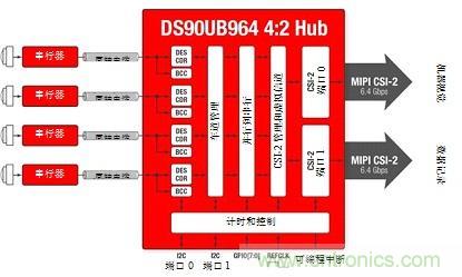 圖3所示為四攝像頭係統,具有由彩色塊所示的不同數據速率。聚合數據在移動工業處理器接口(MIPI)攝像頭串行接口(CSI)-2端口0和1兩者處呈現。CSI-2總線具有“突發性”,意味著其以固定數據速率運行、將發送數據為可用狀態,並且當機器空閑時恢複到低功率(LP)狀態。因此,傳感器速度可在不改變ECU處理器時序的條件下進行變化。即使傳感器鏈路以獨立頻率運行,解串器集線器在單個參考時鍾上也可將數據提供給片上係統(SoC)處理器,從而簡化係統時序。