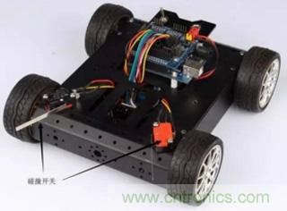 在機器人比賽中,碰撞開關經常被用在碰撞壁障小車上(見圖3)。小(xiao)車(che)前(qian)端(duan)的(de)碰(peng)撞(zhuang)開(kai)關(guan)在(zai)碰(peng)撞(zhuang)到(dao)障(zhang)礙(ai)物(wu)時(shi)就(jiu)會(hui)給(gei)控(kong)製(zhi)器(qi)反(fan)饋(kui)一(yi)個(ge)信(xin)號(hao),告(gao)訴(su)控(kong)製(zhi)器(qi)前(qian)方(fang)左(zuo)側(ce)或(huo)右(you)側(ce)有(you)障(zhang)礙(ai)物(wu),程(cheng)序(xu)再(zai)控(kong)製(zhi)小(xiao)車(che)轉(zhuan)彎(wan)避(bi)開(kai)障(zhang)礙(ai)物(wu)。