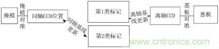 具體包括:步驟1:采用掩模對準傳感器對工件台基準版上的基準標記進行位置測量;步驟2:通過該基準標記上的第一標記對掩模對準傳感器進行位置標定;步驟3:通過該對準標記上的第二標記對基板對準傳感器進行位置標定。