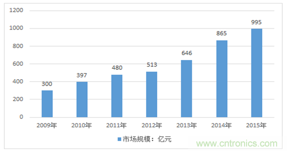 近年來,國內傳感器市場持續快速增長,年均增長速度超過20%,2011年傳感器市場規模為480億元,2012年達到513億元,2015年則達到995億元。近幾年我國傳感器行業市場規模情況如下圖所示: