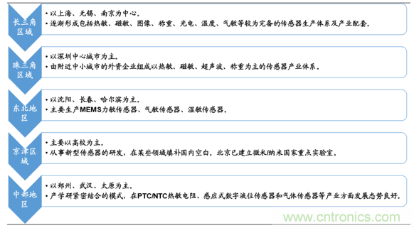 目前我國傳感器企業正努力追趕國外企業,並出現區域的傳感器企業集群,企業主 要集中在長三角地區,並逐漸形成以北京、上海、南京、深圳、沈陽和西安等中心城市 為主的區域空間布局。隨著物聯網的快速發展,其他區域的傳感器產業也將被帶動發展 起來。另外在國家的“雙加工程”(加大力度和加快發展)的政策支持下,本土傳感器企 業有望提升技術攫取更多的市場份額。