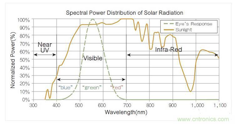 圖1 太陽光的光譜功率分布,其中的強功率紅外線成分對人眼而言是不可見的。