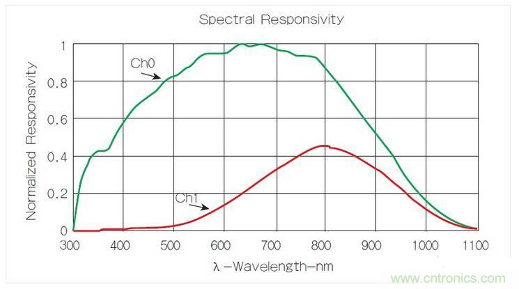 艾邁斯半導體已針對這個問題提出一個更好的解決方案:雙二極管(dual-diode)模塊。其中一個光電二極管(如圖2中所示的Channel 0)用來感測全光譜,另一個(圖中的Channel 1)則主要用來感測光譜中的紅外線部分。從全光譜傳感器的輸出中減掉紅外線光電二極管的輸出,則可得到可見光的測量結果。