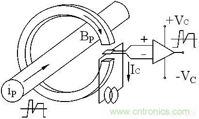 開環霍爾電流傳感器基於直測式霍爾原理,即開環原理(也稱隻測試霍爾),原邊電流IP產(chan)生(sheng)的(de)磁(ci)通(tong)被(bei)高(gao)品(pin)質(zhi)磁(ci)芯(xin)聚(ju)集(ji)在(zai)磁(ci)路(lu)中(zhong),霍(huo)爾(er)元(yuan)件(jian)固(gu)定(ding)在(zai)很(hen)小(xiao)的(de)氣(qi)隙(xi)中(zhong),對(dui)磁(ci)通(tong)進(jin)行(xing)線(xian)性(xing)檢(jian)測(ce),霍(huo)爾(er)器(qi)件(jian)輸(shu)出(chu)的(de)霍(huo)爾(er)電(dian)壓(ya)經(jing)過(guo)特(te)殊(shu)電(dian)路(lu)處(chu)理(li)後(hou),副(fu)邊(bian)輸(shu)出(chu)與(yu)原(yuan)邊(bian)波(bo)形(xing)一(yi)致(zhi)的(de)跟(gen)隨(sui)輸(shu)出(chu)電(dian)壓(ya),此(ci)電(dian)壓(ya)能(neng)夠(gou)精(jing)確(que)反(fan)映(ying)原(yuan)邊(bian)電(dian)流(liu)的(de)變(bian)化(hua)。原(yuan)理(li)圖(tu)及(ji)外(wai)形(xing)如(ru)下(xia):