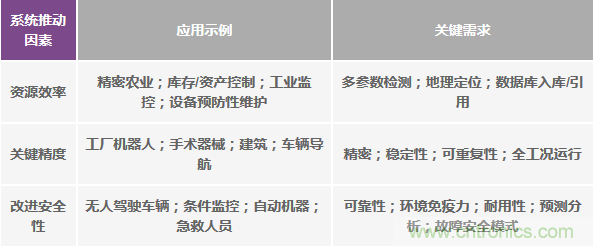 工gong業ye機ji械xie和he流liu程cheng最zui具ju價jia值zhi的de進jin步bu集ji中zhong在zai有you形xing的de係xi統tong級ji優you勢shi上shang,而er這zhe通tong常chang會hui帶dai來lai設she計ji和he實shi現xian方fang麵mian的de挑tiao戰zhan,這zhe些xie挑tiao戰zhan又you會hui發fa展zhan成cheng新xin的de問wen題ti解jie決jue方fang案an和he業ye務wu模mo式shi。這zhe種zhong係xi統tong級ji推tui動dong因yin素su可ke以yi歸gui納na為wei三san項xiang追zhui求qiu,即ji對dui資zi源yuan效xiao率lv、關鍵精度和更高安全性的追求。瞄準這些橫跨多個行業的改進的應用,包括跨越空中/地麵/海上、室內/室外、短期/長期和人/機等,但無論如何,它們都依賴於共同的屬性;即精度、可靠性、安全性和智能處理與分析,如表1所示。