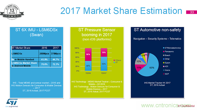ST擁有較全的MEMS產品線,廣泛應用於消費、汽車、工業三大市場,能為客戶提供最廣泛的MEMS傳感器組合。值得一提的是,ST在消費電子市場主要供應6軸傳感器,占據了44%的市場份額;其中一款明星產品氣壓傳感器在手機、無人機等高檢測產品上廣受歡迎。2017年,ST在氣壓傳感器市場上占據了62%份額,主要分布在汽車非安全應用上,如中控方麵。