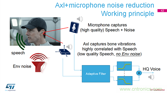針對現場工程師提出的對ST耳er機ji方fang案an通tong過guo骨gu振zhen動dong傳chuan感gan器qi優you化hua上shang行xing語yu音yin質zhi量liang的de疑yi問wen,董dong愷kai表biao示shi,在zai傳chuan統tong的de耳er機ji方fang案an中zhong,聲sheng音yin隻zhi能neng通tong過guo空kong氣qi傳chuan到dao麥mai克ke風feng。而er這zhe種zhong方fang式shi會hui導dao致zhi麥mai克ke風feng采cai集ji到dao大da量liang環huan境jing噪zao音yin,嚴yan重zhong影ying響xiang耳er機ji的de上shang行xing語yu音yin信xin號hao。而erST的耳機方案則能通過骨振動傳感器采集到的聲帶信息,對比分析出環境噪音並衰減,從而實現更準確地語音輸出。
