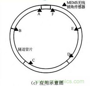 無線傾角傳感器采用電池供電,將MEMS無線傾角傳感器安裝在盾構隧道內襯砌圓環的管片上,包括封頂塊、鄰接塊、標準塊、封底塊和塊與塊間以環向螺連接構成的縱向接頭等不同部位;實時測量隧道管片內各部位的傾斜角度,通過組合計算得出管片的實際形變,實現對隧道結構變化準確、有效地實時監測,應用示意如圖(c)所示。