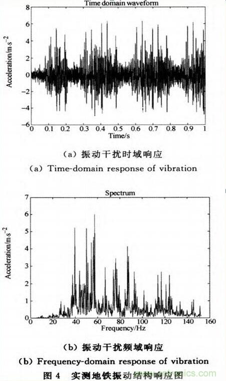 從圖(4)看出,地鐵振動噪聲頻率主要集中在20---160Hz,其他頻段的分量很小。地鐵振動在隧道結構上產生的噪聲幅值一般是0.029左右。由於SCAl00T分辨率非常高,可以識別出40ug左(zuo)右(you)的(de)微(wei)加(jia)速(su)度(du)信(xin)號(hao),在(zai)傾(qing)角(jiao)測(ce)量(liang)過(guo)程(cheng)中(zhong)很(hen)容(rong)易(yi)受(shou)到(dao)地(di)鐵(tie)振(zhen)動(dong)噪(zao)聲(sheng)的(de)幹(gan)擾(rao)。因(yin)此(ci)需(xu)要(yao)給(gei)控(kong)製(zhi)器(qi)選(xuan)擇(ze)合(he)適(shi)的(de)數(shu)字(zi)濾(lv)波(bo)算(suan)法(fa),消(xiao)除(chu)地(di)鐵(tie)振(zhen)動(dong)噪(zao)聲(sheng)對(dui)傳(chuan)感(gan)器(qi)精(jing)度(du)的(de)影(ying)響(xiang)。