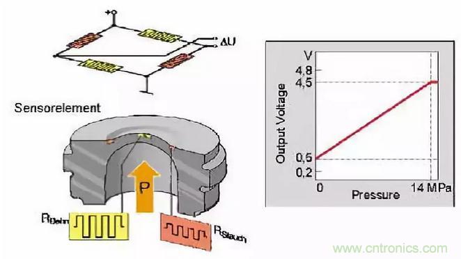 的惠斯頓電橋,膜片的變形導致應變計電阻變化,通過外圍電路的的信號處理後,形成與壓力成線