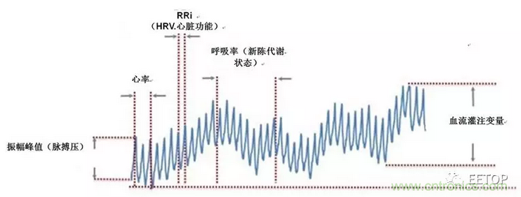 光學心率傳感器可生成測量心率的PPG波形並將該心率數據作為基礎生物計量值,但是利用PPG波形可以測量的對象遠不止於此。盡管很難取得和維護精確的PPG測量結果(我們將在下一篇詳細論述它),但是如果您能夠成功獲得精確的PPG測量結果,它將發揮強大的作用。高品質PPG信號是當今市場需求的大量生物計量的基礎。圖2是經過簡化的PPG信號,該信號代表了多個生物計量的測量結果。
