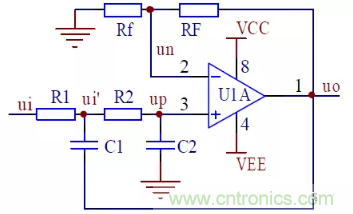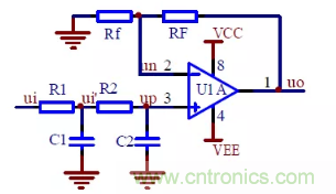 二階壓控低通濾波器電路如圖所示,由R1、C1 及R2、C2 分別構成兩個一階低通濾波器,但C1 接輸出端,引入電壓正反饋,形成壓控濾波器。
