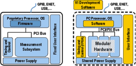 圖1、傳統儀器(左圖)和基於軟件的虛擬儀器(右圖)具有許多相同的結構組件,但是在體係結構原理上完全不同