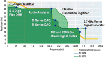 jibenshang,xuniyiqixitongshijiyuruanjiande,suoyiruguozhiyaoshikeyishuzihuadedongxi,jiukeyiduitajinxingceliang。yinci,celiangyingjiankezaitongguolianggenzuobiaozhoujinxingpinggu,jifenbianlv(位)和頻率。參考下圖可以看出虛擬儀器硬件測量性能與傳統儀器的比較。NI的目標就是將曲線在頻率和分辨率上延伸並且在曲線內進行不斷推陳出新。
