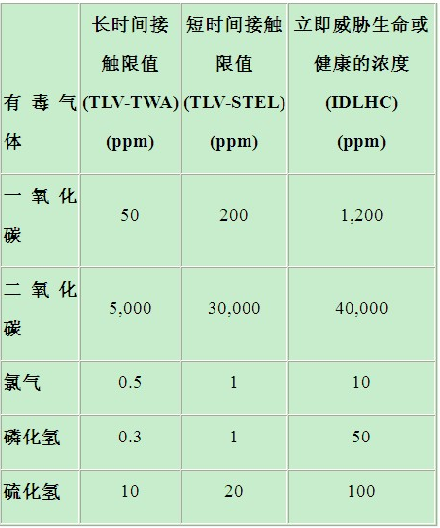 在美國,國家職業安全與健康研究所(NIOSH)和美國政府工業衛生學家會議(ACGIH)已規定了許多有毒工業氣體的短時間和長時間接觸限值。"閾限值-時間加權平均值"(TLV-TWA)是指大多數工人可以在正常8小時工作日內反複接觸而不會受到有害影響的時間加權平均濃度。"閾限值-短時間接觸限值"(TLV-STEL)是指大多數工人可以短時間接觸而不會受到刺激或傷害的濃度。"立即威脅生命或健康的濃度"(IDLHC)是一種限製性濃度,它會對生命立即或緩慢產生威脅,導致不可逆轉的健康損害,或者影響工人獨立逃生的能力。表1列出了幾種常見氣體的限值。