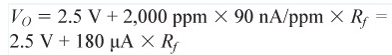 傳感器的最大響應為90 nA/ppm,如表2所示,其最大輸入範圍為2,000 ppm.因此,最大輸出電流為180 μA,最大輸出電壓由跨導電阻決定,如公式2所示。